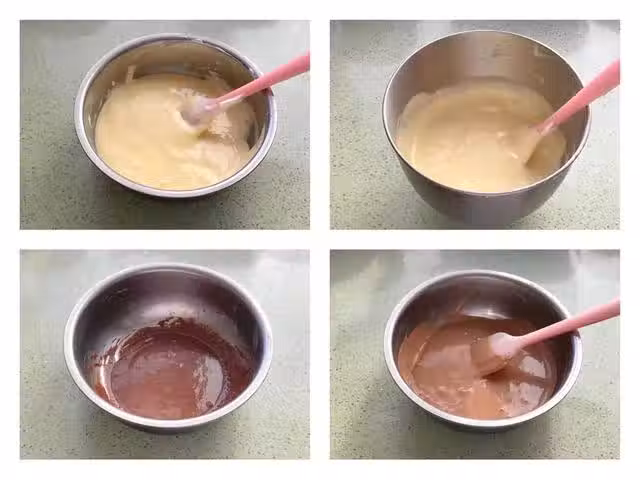 4、取8寸的活底陽極模具,先倒入一部分的原味麵糊,接著再擠入適量的可可麵糊,依次重複,花紋根據自己的喜好隨意擠,最後將模具端起來輕輕地震幾下震出大氣泡,然後放入預熱好的烤箱中,上下火150度烤45分鐘左右,烤好後震幾下震出熱氣,然後再迅速倒扣放置晾涼後脫模。