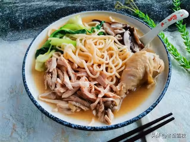 7.把麵條盛出到碗內,放上雞腿和雞絲,淋幾滴香油,一碗香噴噴的早餐雞腿麵就做好了。