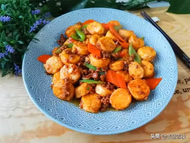 【肉末日本豆腐】所需材料:雞蛋豆腐5袋、尖椒1個、胡蘿蔔半根、豬肉100克、油適量、蔥1段、姜2片、大蒜2瓣、紅燒醬油半湯匙、海鮮醬油1湯匙、蚝油1湯匙、料酒半湯匙、水澱粉適量、