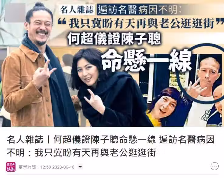 何超儀曾在採訪中透露整個過程,陳子聰當時去澳洲探親,幫家人搬家具時壓傷了腰,不久後痛到昏厥,送醫才發現爆血管,開刀後看到一肚子血,醫生逐一將器官夾起來清洗,結果不慎夾爛他的尿管,導致術後長期帶著尿袋的他一度抑鬱想不開。