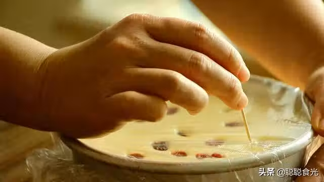 步驟七:放在桌面上輕輕震幾下,震出裡面的氣泡,還可以放點蔓越莓干或者葡萄乾,蓋上保鮮膜防止水蒸氣滴入蛋糕中,用牙籤扎幾個洞排氣。