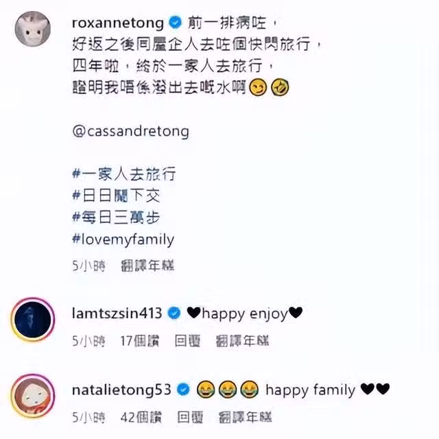 唐詩詠及林子善祝賀旅途愉快,有網民則搞笑留言:可以和家人一起去旅行,真是一件好開心好開心的事,下次記得算馬(國)明一份啊、馬生賺錢馬太享受,幸福!