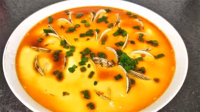 把蛋液過篩倒入盤中,蛋液不要漫過花蛤,撇去中間的泡沫。
