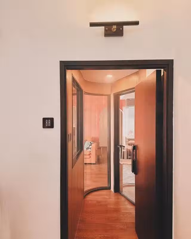 又擺放了一張橙色沙發,旁邊是開放式廚房,中間通往房間的走廊則特別設計了一道拱門,充滿格調的設計儼如置身新派酒店。