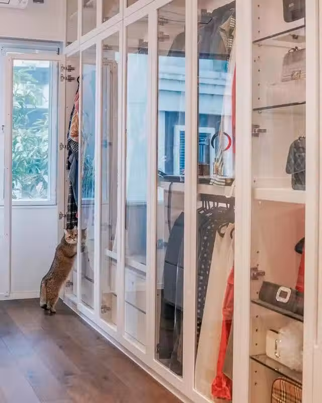 下層擺放Chanel、Prada、 Miu Miu等高踭鞋及皮鞋,另一邊亦有專門掛各式各樣帽子的衣架。