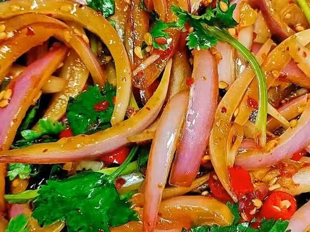 3、涼拌汁倒入洋蔥絲中,抓拌均勻即可端上桌開吃。