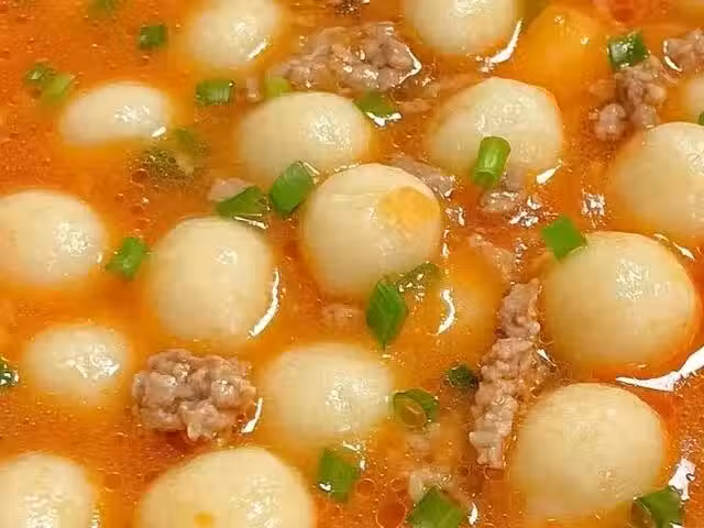 5、山藥丸子煮至浮起來煮熟,再放入肉末和蔥花,攪拌均勻煮一分鐘即可出鍋開吃。