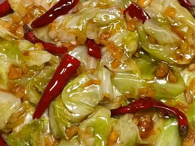 2、起鍋燒油,油熱後放入蒜末和干辣椒爆香,再放入包菜翻炒均勻,炒軟後倒入醬汁翻炒均勻,炒熟後出鍋裝盤開吃。