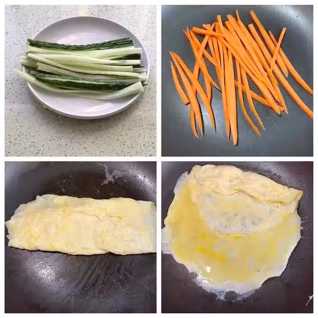 3、將煎好的蛋餅取出,放在案板上用刀切寬窄相等的蛋絲,將切好的蛋絲放入盤中備用。