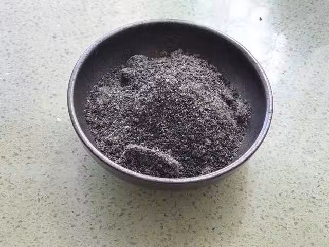 第四步:將炒好的糯米粉倒進黑芝麻粉中混合均勻,然後再加入30克的紅糖混合均勻。紅糖可以用白砂糖代替,建議使用紅糖,紅糖比白糖更有益健康。