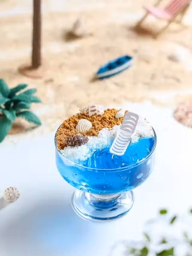 5.撒上椰蓉和餅乾碎裝飾成沙灘效果就完成啦