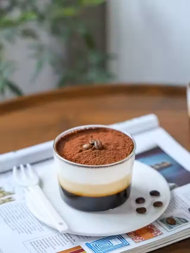5.倒入杯中冰箱至凝固,撒上可可粉即可,三層顏色不同的咖啡凍就做好了