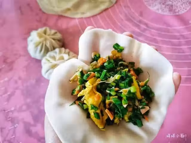 7、包好的韭菜餅收口處要捏緊實一些,依次包好所有的韭菜餅。
