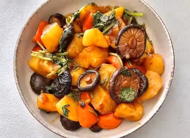 2、起鍋燒油,加入土豆胡蘿蔔煸炒至金黃,加入半勺老抽、一勺生抽、一勺素蚝油、半勺鹽、干香菇,翻炒上色,加入清水沒過食材(清水中加入一勺澱粉)
