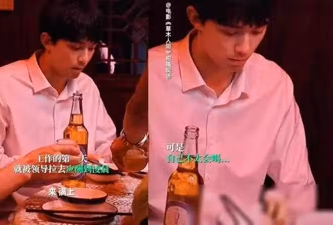 他用手扶住酒杯,低頭盯著酒杯一動不動,那份緊張與無助讓人感同身受。而當經理高聲質問時,他猛地抬頭,舌頭舔了下乾燥的唇,這個動作將他的緊張與害怕展現得淋漓盡致。最後,他仰頭一口悶下酒,苦澀與無奈溢於言表,令人心疼不已。