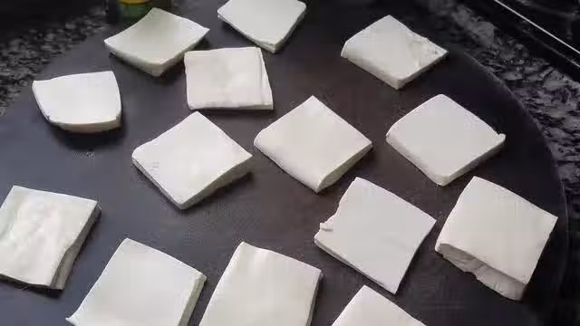 2.把浸泡過鹽水的豆腐沾上準備好的生粉,然後裝進去盤子裡備用。