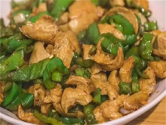 步驟6.倒入青椒翻炒15秒左右,再倒入麵筋翻炒。
