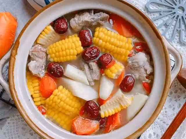 【原材料】排骨、山藥、玉米、胡蘿蔔、枸杞、紅棗、生薑、料酒、食鹽、白鬍椒粉;