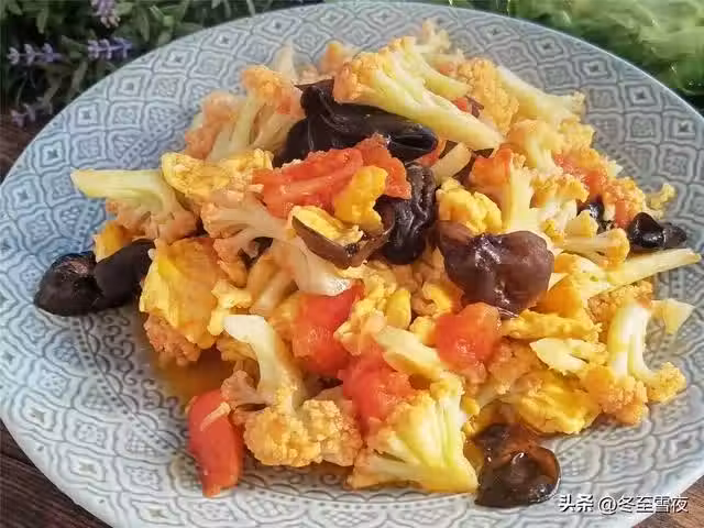 【菜花炒雞蛋】所需材料:菜花半棵、雞蛋4個、西紅柿1個、木耳適量、油鹽適量、蔥1段、白糖少許、