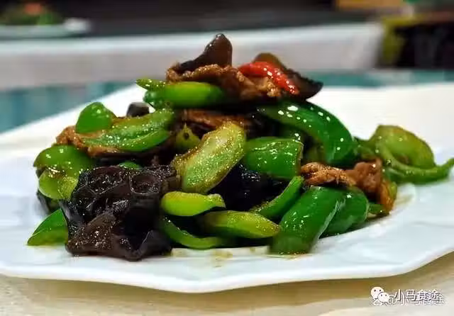 2.起鍋燒油,下入姜蒜片爆香,下入柿子椒炒至剛斷生,接著下入木耳炒勻,調入鹽、生抽、味精或者雞精,快速炒勻,即可出鍋裝盤。