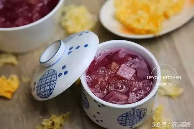 第一步:準備食材。銀耳2朵、紫薯2個、冰糖20克。(糖的量隨自己的口味來放。)