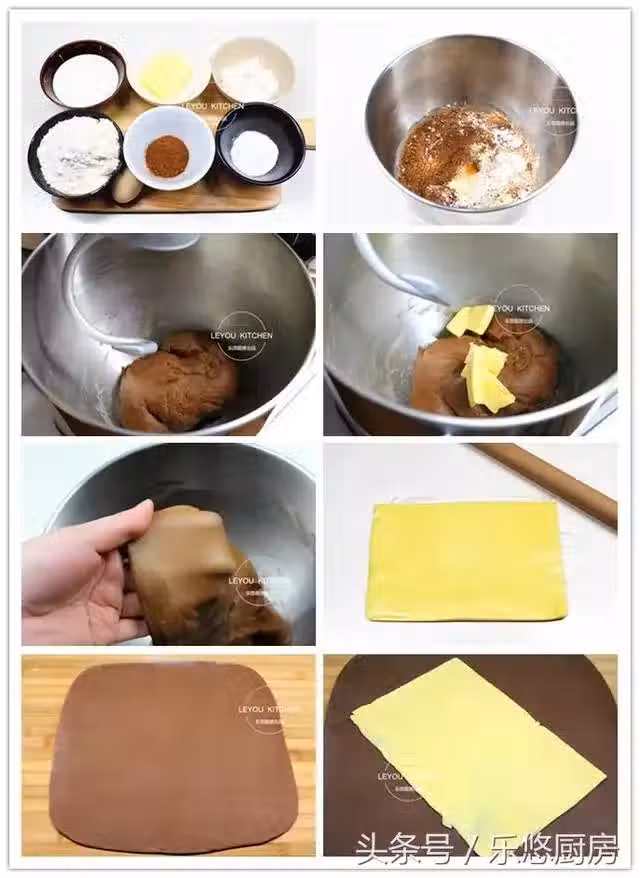 把九步:四周的麵餅疊起來,把黃油包嚴實,如圖。然後稍稍擀開,擀成薄厚均勻的長方形。(在擀的時候一定要注意一些,不要把麵皮弄動,要擀得薄厚一致。)