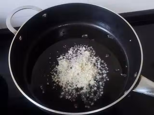 6、等鍋內的蒜粒炸到有些發黃後關火,把剩餘的蒜粒也倒入進去,利於餘溫翻炒均勻,即可盛出。溫馨提示,留一半的蒜在出鍋的時候加,可以讓做好的蒜蓉醬香氣更濃郁。