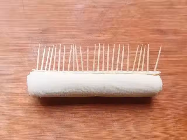 4、然後我們用刀,從牙籤之間的縫隙里切下去就可以了,看上去是不是很像棒棒糖?剩下的食材依次操作。