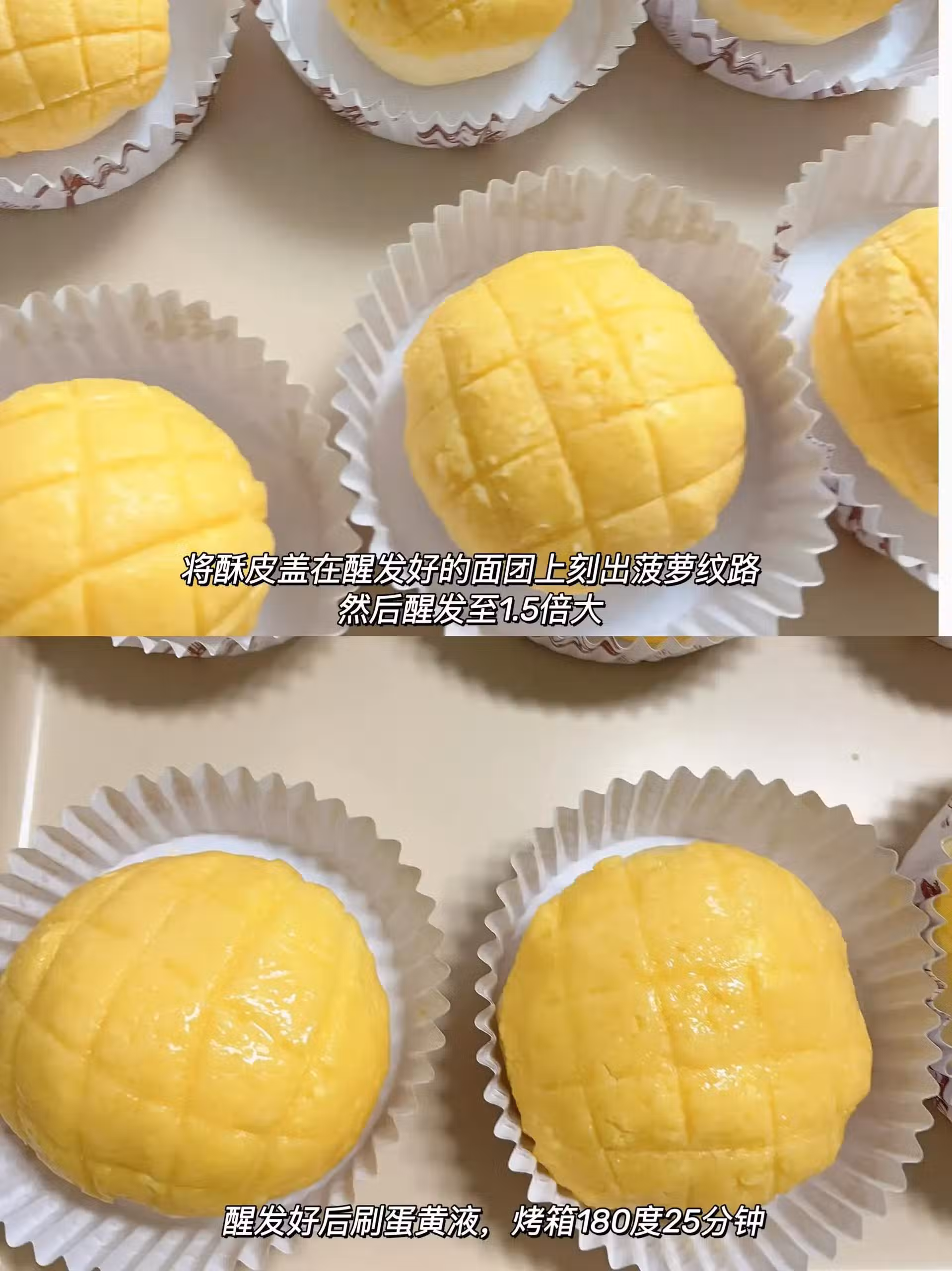 5、發好後,塗上蛋黃液,這樣烤出來的菠蘿包顏色更誘人!預熱烤箱,180度烤25分鐘!