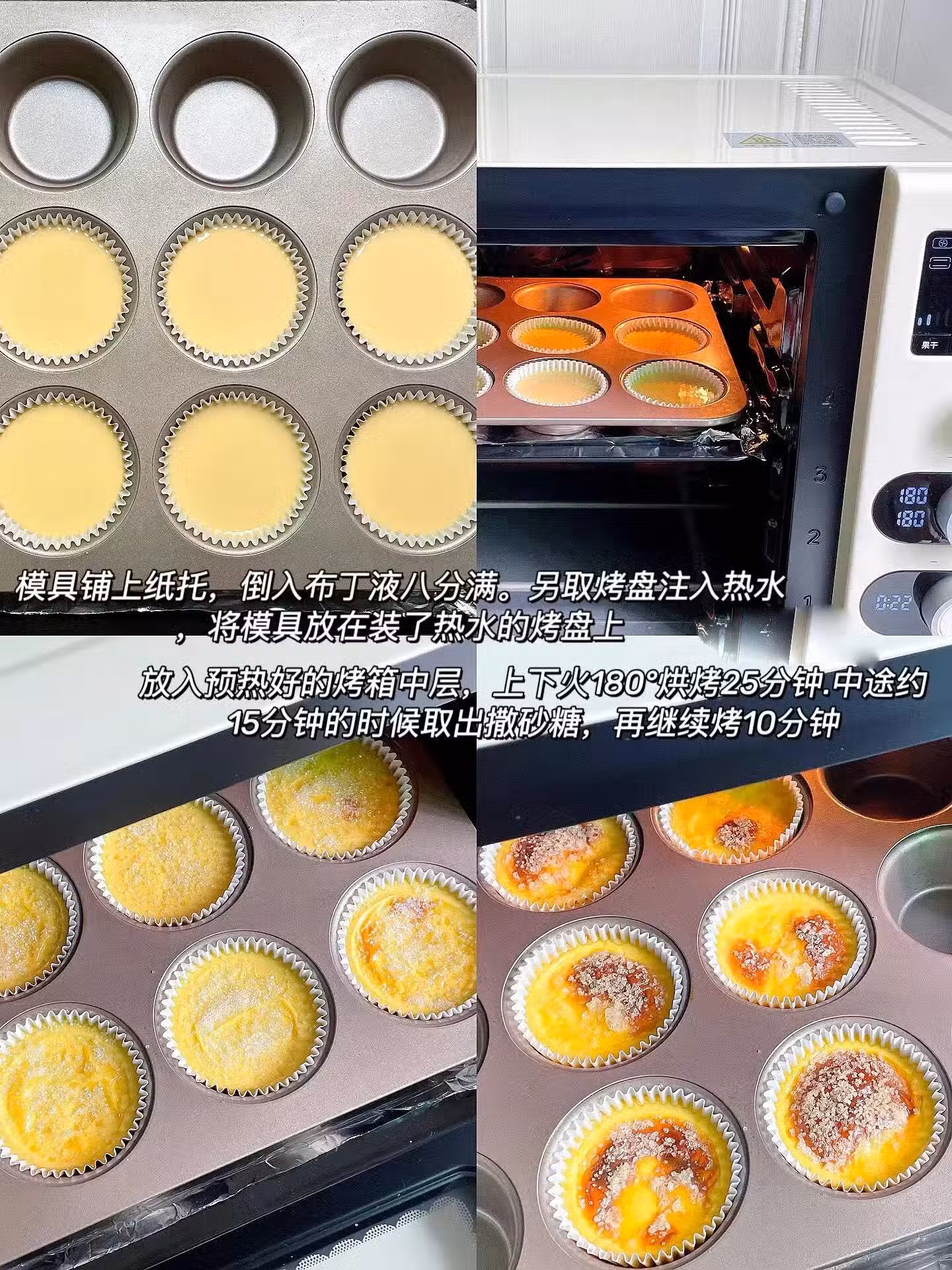 預熱好之後,把模具放入注滿熱水的烤盤中,上下火180°烘烤25分鐘。別忘了,烤到15分鐘時,撒點粗砂糖,這樣焦糖層會更美味哦!(當然,這一步也可以省略,看你心情啦!)