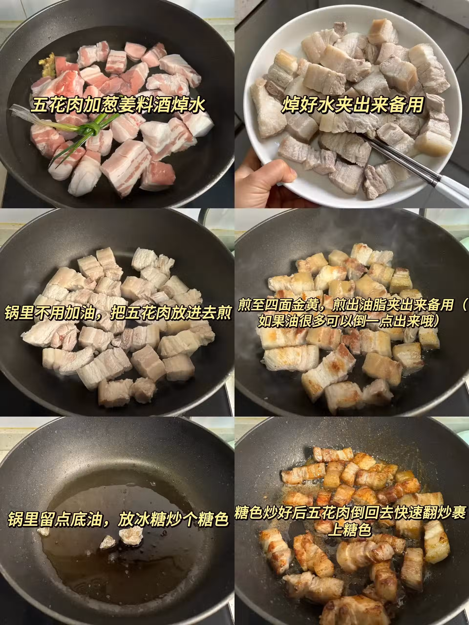 鍋中留些底油,放入冰糖開始炒糖色;炒糖色時需小火慢炒,以免糖色過深影響口感;待冰糖融化成金黃色液體時,迅速將五花肉倒入鍋中翻炒均勻,使其裹上一層亮麗的糖色。