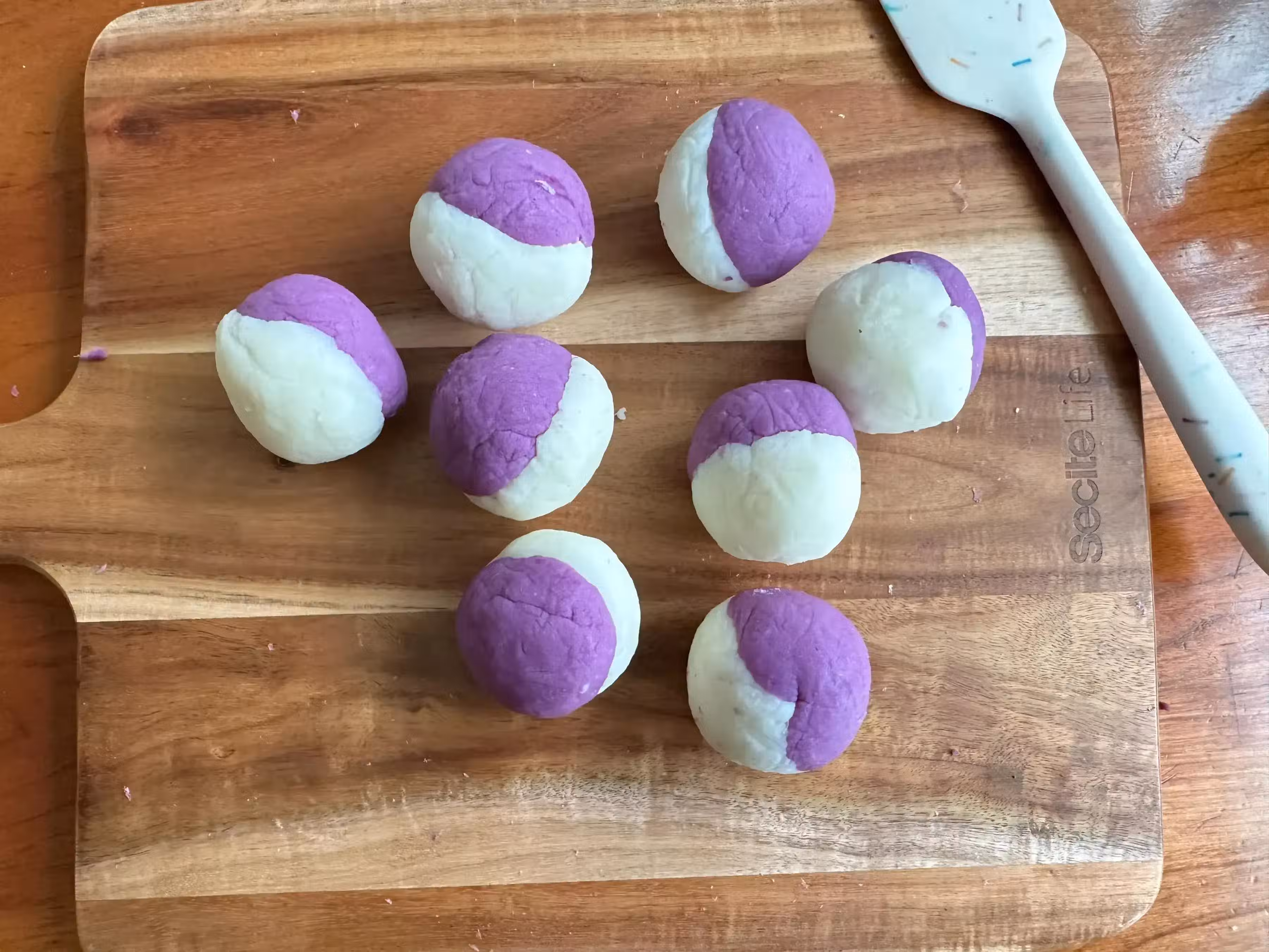 6、取一個小劑子,搓一個小洞,擠入草莓醬,封口,搓圓;之前分享過草莓醬做法;大家可以去翻看一下。