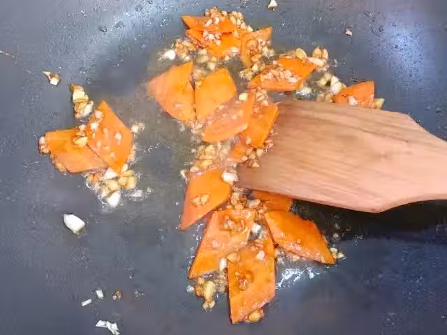 ④、等胡蘿蔔變軟後再加入油麥菜翻炒,翻炒時因為油麥菜水分較少,所以要加一點點水,防止糊鍋,翻炒至油麥菜變軟時,加入適量的鹽和雞精進行調味翻拌均勻,撒上少許白芝麻就可以出鍋裝盤了——(炒油麥菜時加入少許的水防止油麥菜變乾和糊鍋)。