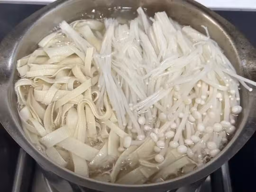 3、瀝干水分的豆腐皮和金針菇加在碗中,加入黃瓜絲和香菜。