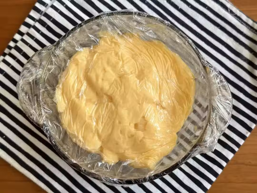 4、淡奶油加白糖打至微微濃稠,加入卡仕達醬速度混勻。