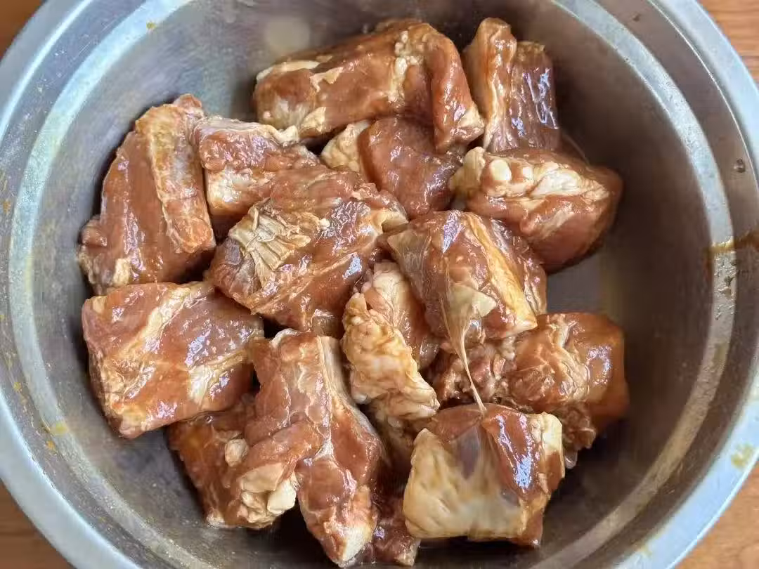 4、糯米提前清水浸泡2個小時左右,瀝干水分備用;把排骨均勻裹上一層糯米。