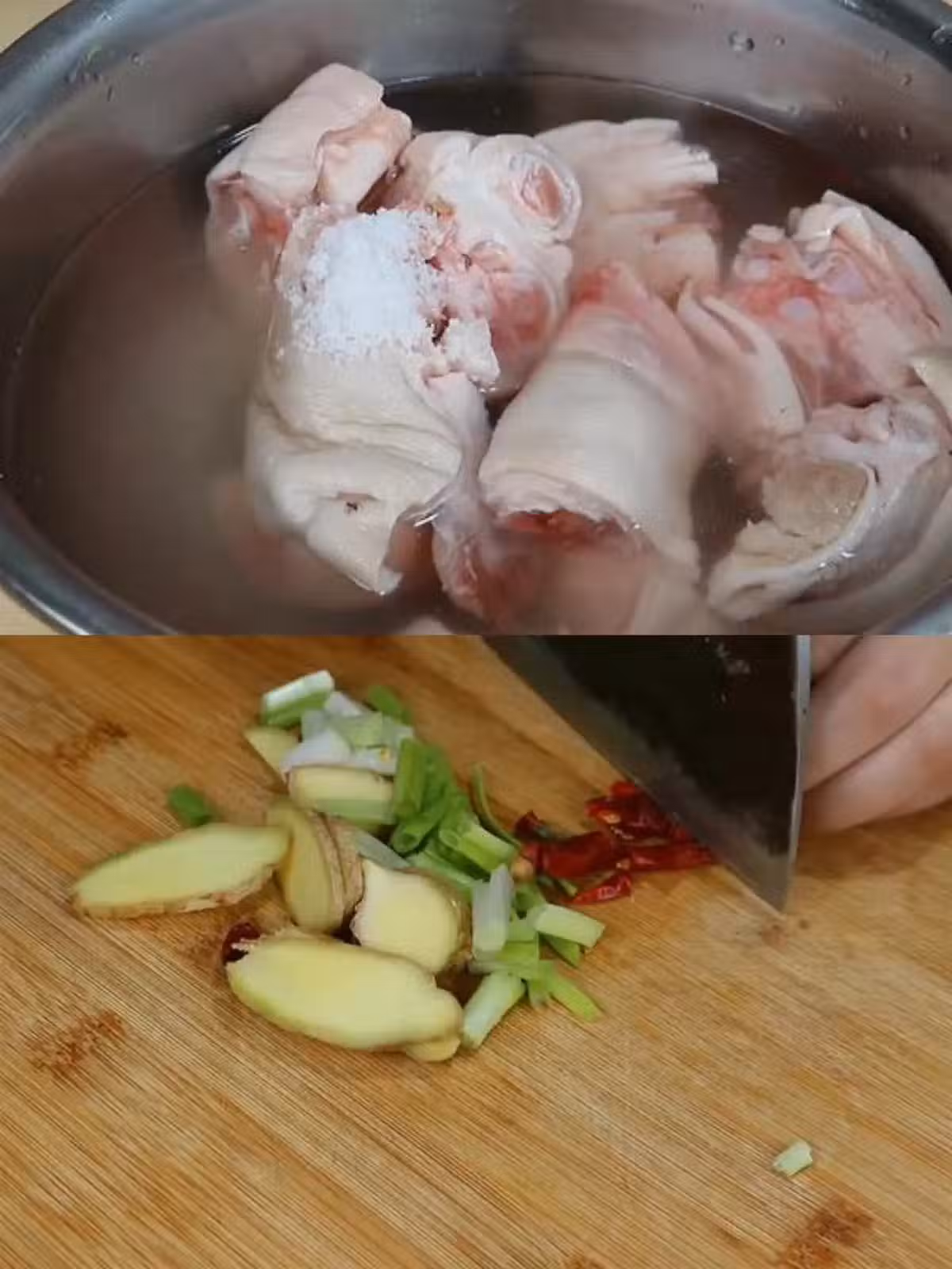【烹飪食材】豬蹄,食鹽,生薑,小蔥,干辣椒,桂皮,八角,食用油,冰糖,生抽,蠔油,老抽