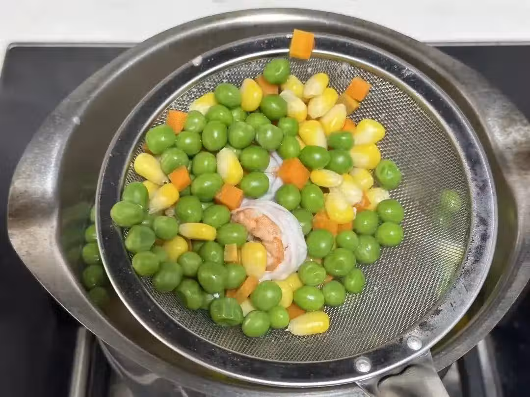 4、不粘鍋加點植物油,把豆腐放進去煎至金黃色,加入雜蔬和蝦仁。