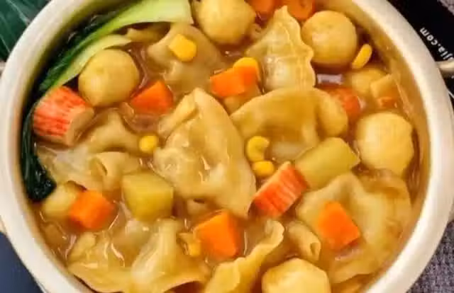 食材:三鮮水餃十二個,咖喱塊兩個,魚丸八個,蟹足棒兩個,土豆,洋蔥,胡蘿蔔丁,玉米粒少許,油菜一顆 做法: