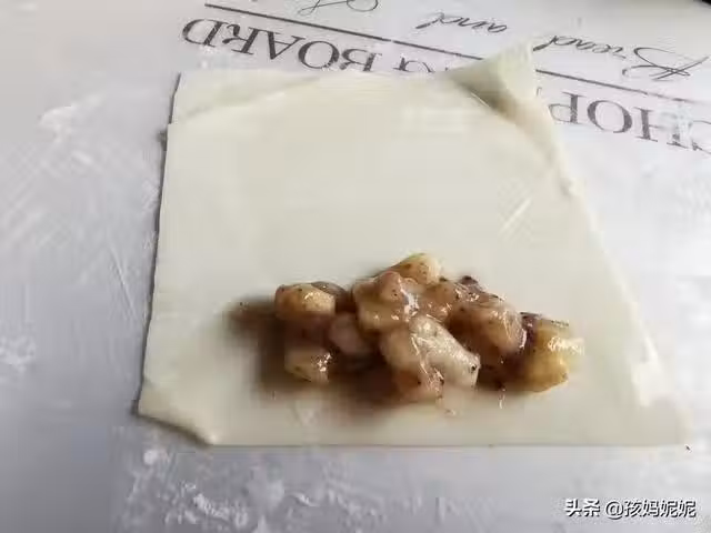 3、取一個餛飩皮,在餛飩皮的一邊放上適量香蕉餡,放入的香蕉餡不可以貪多,放多了包裹不嚴,放到鍋里一炸就露餡了。小編就曾經做過這樣的事,炸了滿鍋餡,嗚嗚