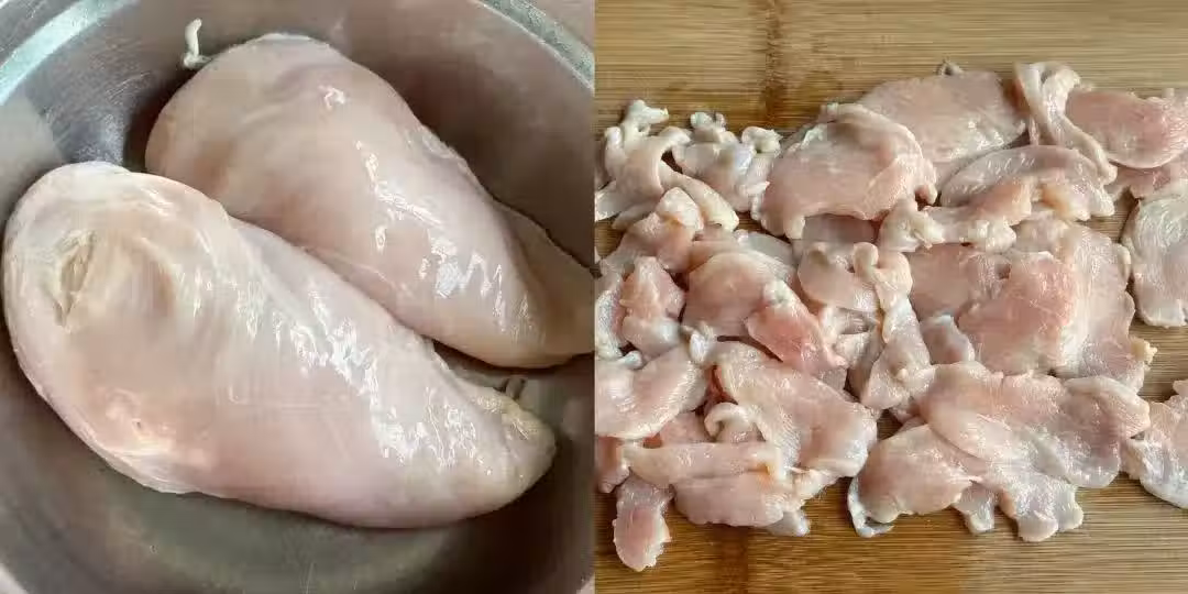2、取一片雞胸肉,兩邊蘸上澱粉,用擀麵杖敲成薄薄的片;如果這一步嫌麻煩,可以換成腌制的方法,煮出來的口感也很好吃!