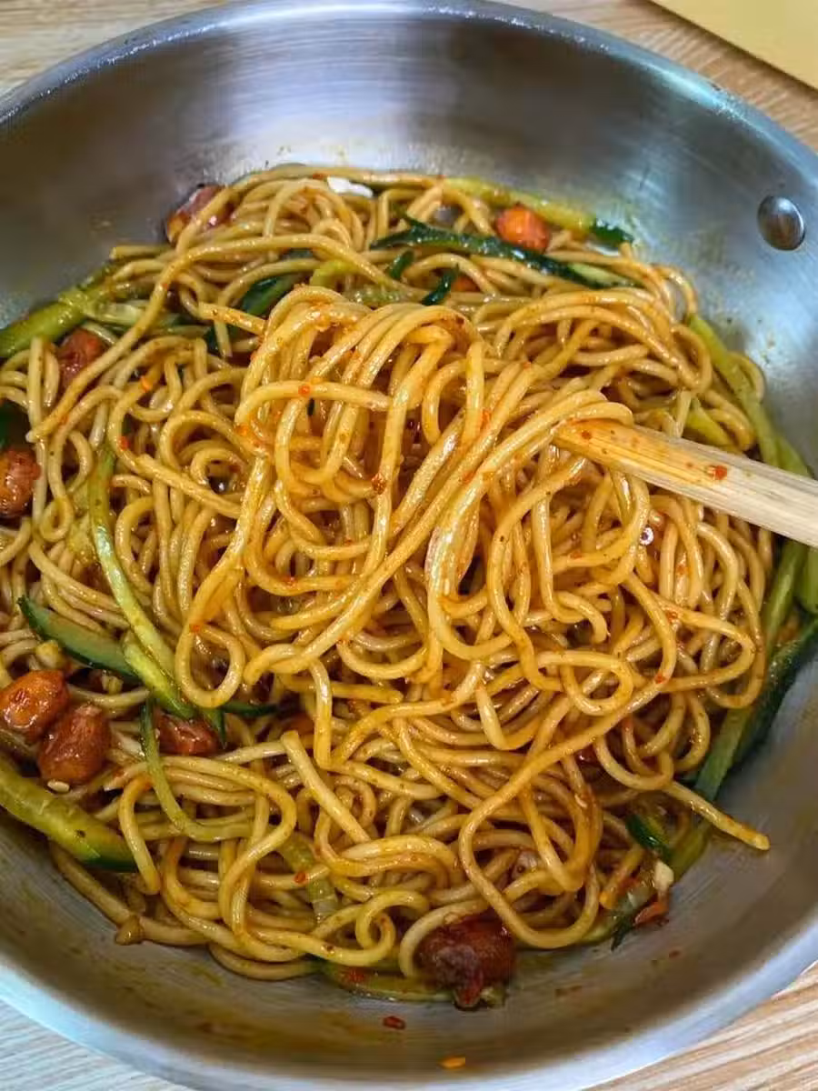 1. 面條的選擇尤為重要,可以使用細圓面或者刀削麵,這樣的面條更加勁道,與醬汁的融合也更好。
