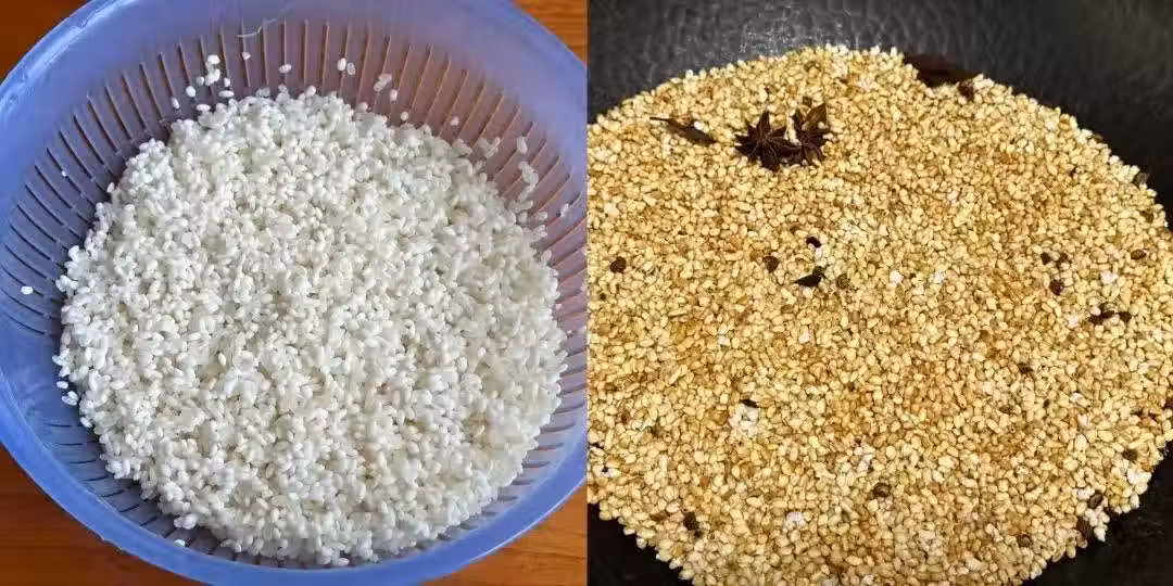 2、把大料、香葉、花椒挑出來不要,放在破壁機打成米粉;取適量的米粉,分次加入清水搓均勻,半干不濕的狀態就可以。