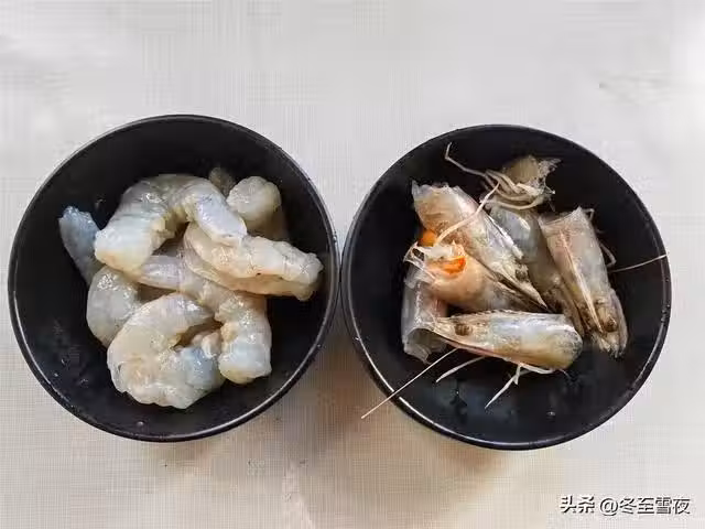 3.把大蝦的頭切下來,放在碗內待用,把蝦身的蝦皮剝下來,再把蝦仁的背部,片一刀,取出蝦線,把蝦仁放在碗內,加入少許白鬍椒粉,料酒,少許鹽,抓勻,腌制幾分鐘。把蝦仁的背部片開,這樣蝦仁更容易熟,加入白鬍椒粉和料酒,可以去除大蝦的腥味。