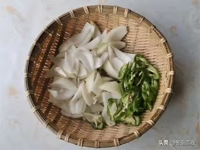 3.把洋蔥切成塊,尖椒斜刀切辣椒圈。姜切片,大蒜切成兩半。
