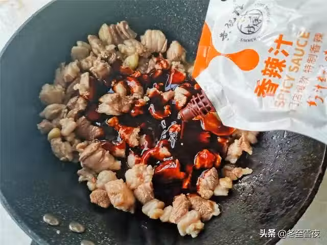 5.再淋入香辣汁,口重的一斤肉放一袋,口輕的一斤肉放半袋就可以了,用的是黃記煌的一汁成菜調料,有很多口味的,輕鬆調味,一汁成菜。