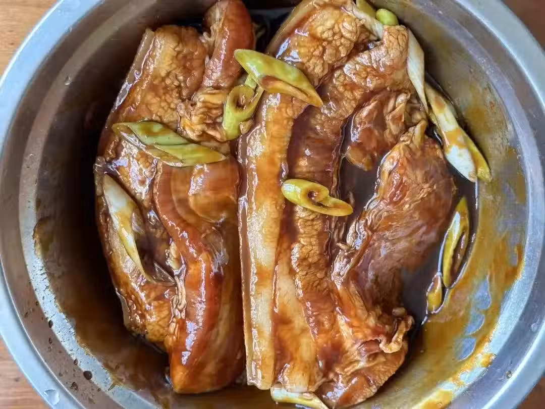 4、腌制好的五花肉取出,放入電飯煲中。為了讓五花肉在烹飪時不會糊底,我們需要加入約半碗清水。然後蓋上電飯煲的蓋子,開始烹飪。大約30-40分鐘後,當筷子能夠輕鬆穿透五花肉時,就說明它已經烹飪完成了。