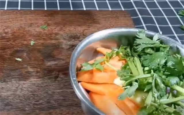 4.洋蔥切成細絲,胡蘿蔔和生薑切成片狀,芹菜切成3到4厘米長的段,全部切完以後放入盆中備用。