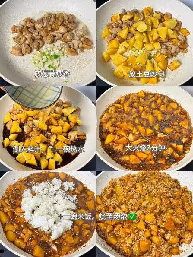 4、放入土豆塊,倒入調好的料汁及適量的熱水,大火燒至湯汁濃稠,最後倒入煮熟的米飯拌均即可。