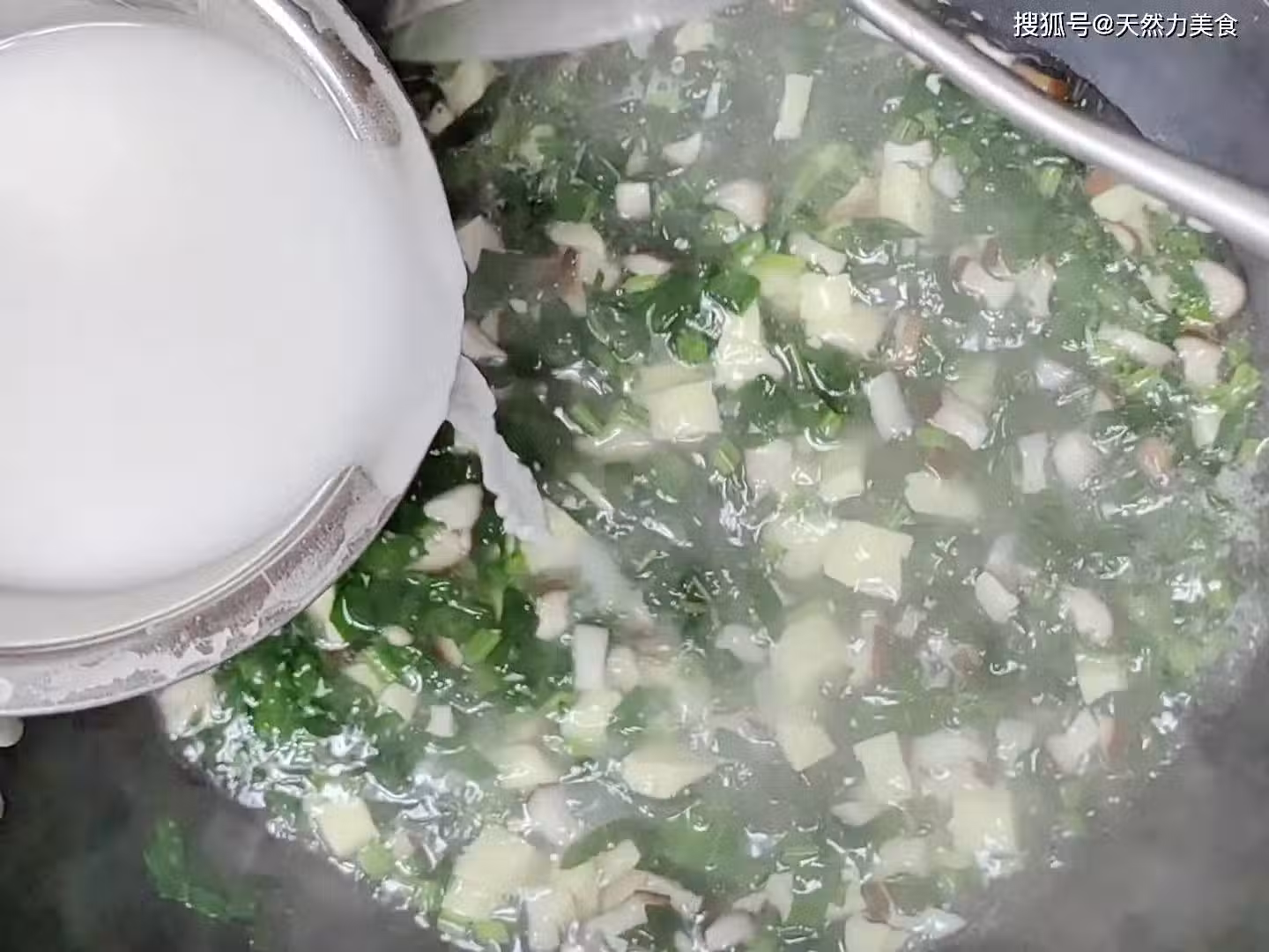 5、水澱粉加完後就改大火,等鍋中的水再次開鍋後就把蛋清慢慢倒進鍋內,倒的時候倒慢些,也是邊倒邊用勺子攪拌,這樣打出來的蛋花才漂亮。